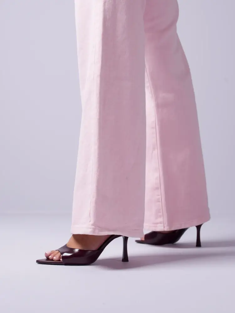 Rosa t-skjorte fra Mango 279,- Hvit blazer med belte fra Mango 1499,- Rosa jeans fra Gina Tricot 499,- Burgunderfargede hæler fra Mango 499,-