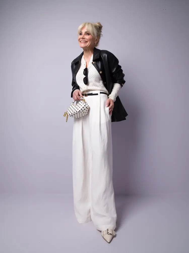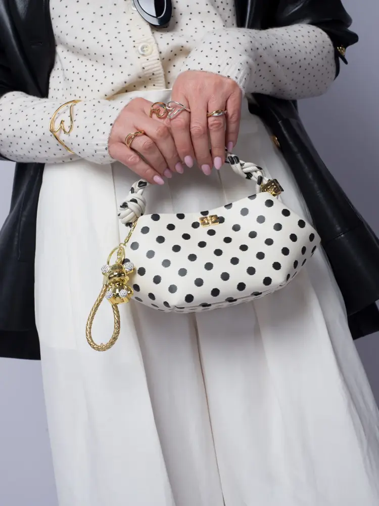 Sort skinnjakke fra Follestad 6999,- Prikkete cardigan fra Mango 499,- Lyse bukser fra Line of Oslo 2199,- Prikkete Ganni-veske fra Mark + Brandy 4000,- Kortholder fra Mark + Brandy 900,- Belte fra Kiman Woman 1750,- Solbriller fra Follestad 2499,- Smykker fra Pandora fra 700,- Veskepynt fra Swah 299,- Sko fra Bekkestua Sko 2999,-