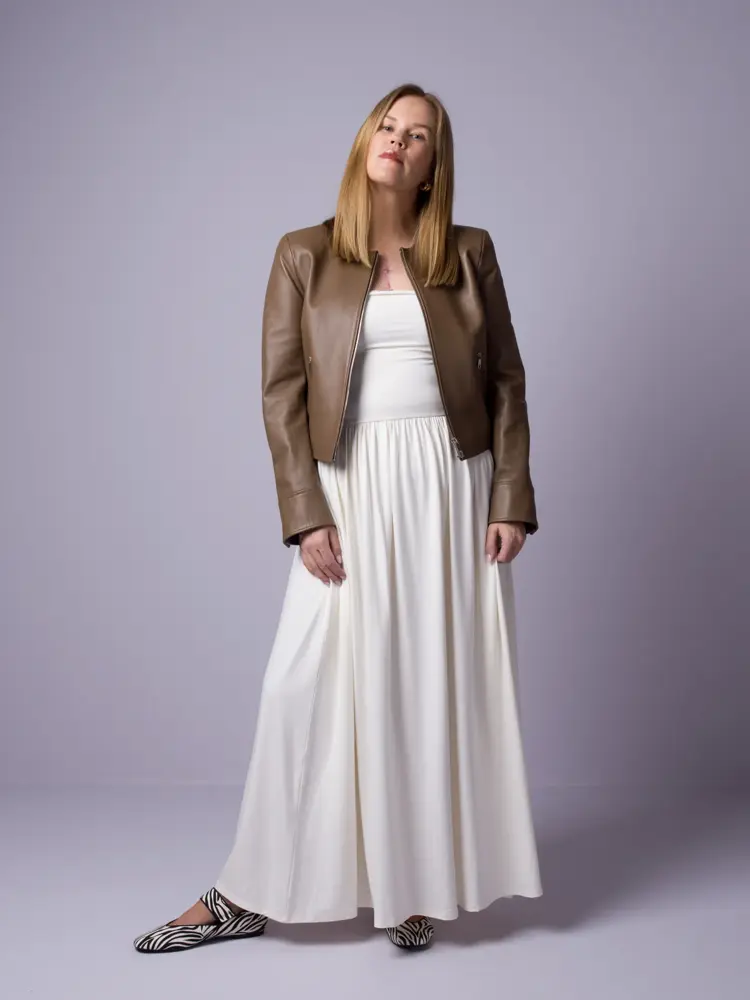 Brun skinnjakke fra Follestad 6199,- Hvit tubekjole fra Follestad 2399,- Sebraballerinas fra Zara 399,-