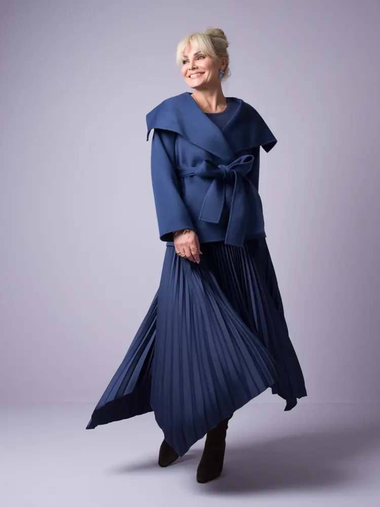 -Blått er jo vakkert, og miksen med det plisserte til tynn ull gir en nydelig materialmiks. En blå kjole med kledde knapper er fin til våren og sommerens hagefester, dåp og bryllup. Klare blå toner er også fantastisk fint til denim, og selvsagt til hvitt, sier Elen.