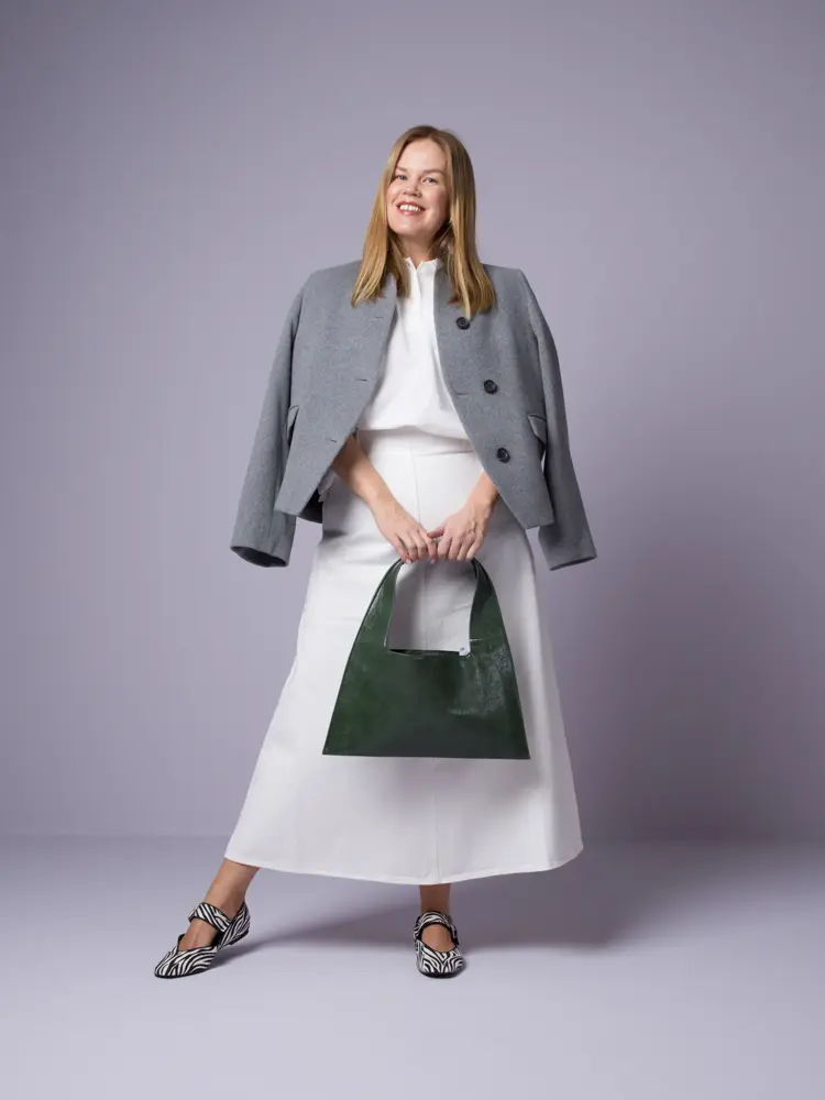 Hvit pique-trøye fra Gina Tricot 299,- Hvitt denimskjørt fra The Vibe 2300,- Grå jakke fra The Vibe 6399,- Sebraballerinas fra Zara 399,- Grønn veske fra Gina Tricot 169,-