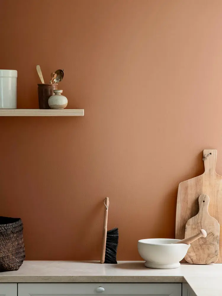 Ved å male de hvite veggene i en dempet hvitfarge som går mot beige, er mye forandret uten å måtte bytte helt stil. Beige-on-beige-paletten, der man bruker ulike lyse farger som går ton i ton, er fortsatt like aktuell. Det, i kombinasjon med finèr på vegger og innredning i treverk, oppleves rommet varmt og naturlig. Det er også lov å være litt tøffere med fargebruken i et moderne hjem nå, med en palett av rødtoner som kan minne om gløden fra solen eller detaljer i dype, rike grønnfarger.