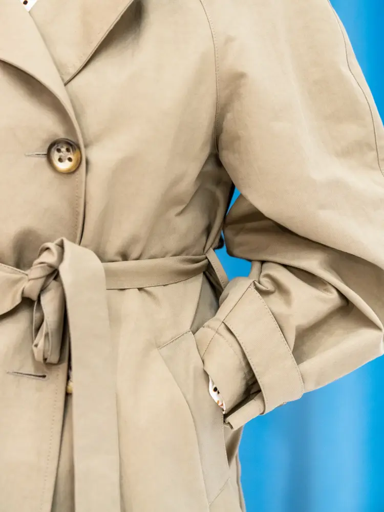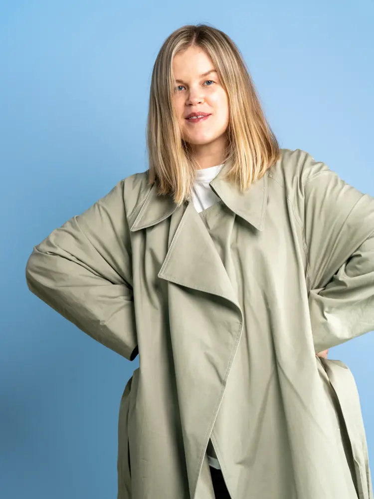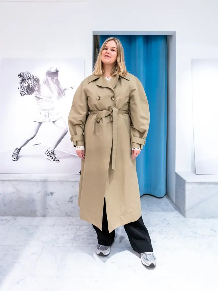 De kommer i ulike snitt, selv om kjernen er den samme – den har gjerne dobbeltspente knapper, belte i livet, krave og litt lengde. Fargepaletten er beige eller beveger seg mot kaki, og du kan velge mellom oversizede eller mer figurnære varianter. Noen har en liten pufferm eller ballongdetaljer i ermene, mens andre er tro den tradisjonelle trenchen.