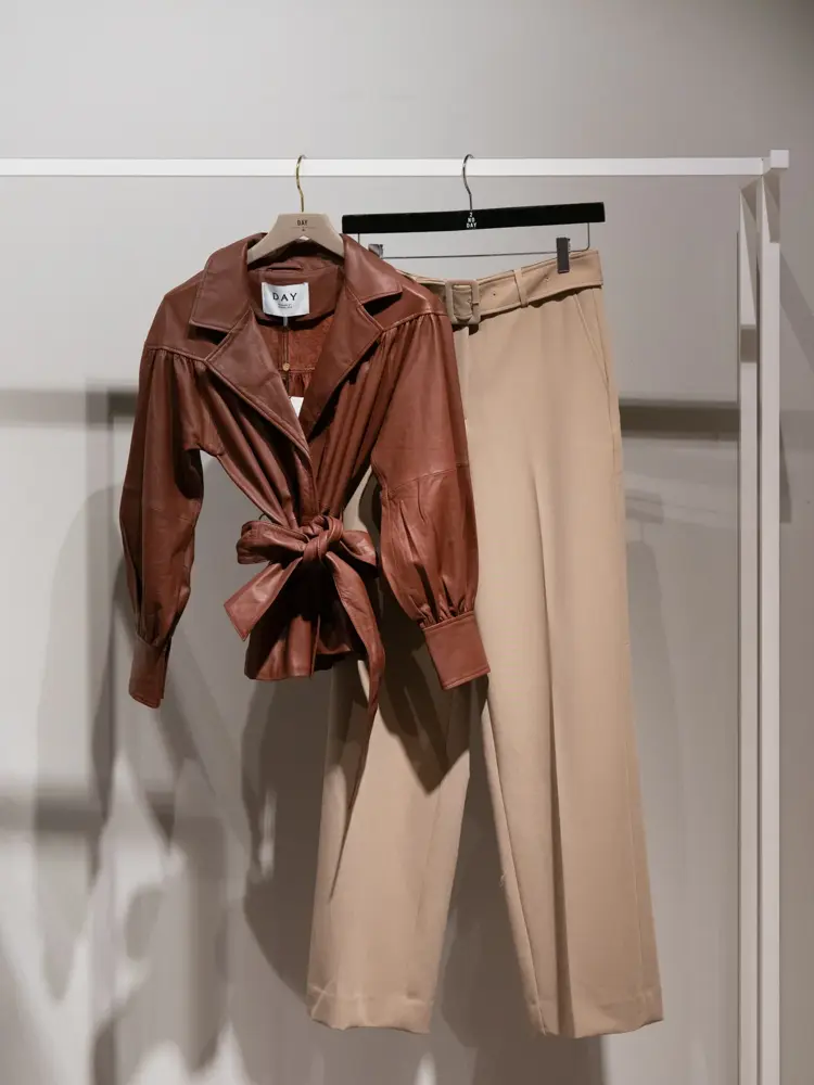 Bruntoner hos Day. Denne skinnjakken og buksen ville vært så fint å style med et par knallrosa hæler.