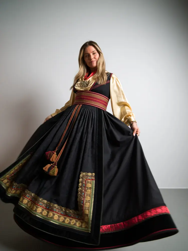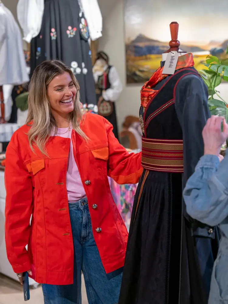 Til seg selv valgte Janka en beltestakk med border og forkle i damask. Blant mange vakre skjorter i silke og bomull og med mønster og uten, var det vanskelig å velge bare én. Janka vil gjerne ha flere å kombinere med, men valget landet på en ensfarget bluse i gult som er vakkert til forgyldte søljer.