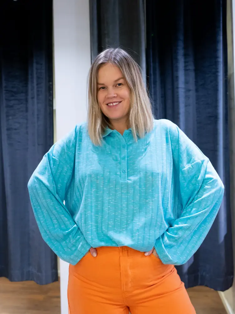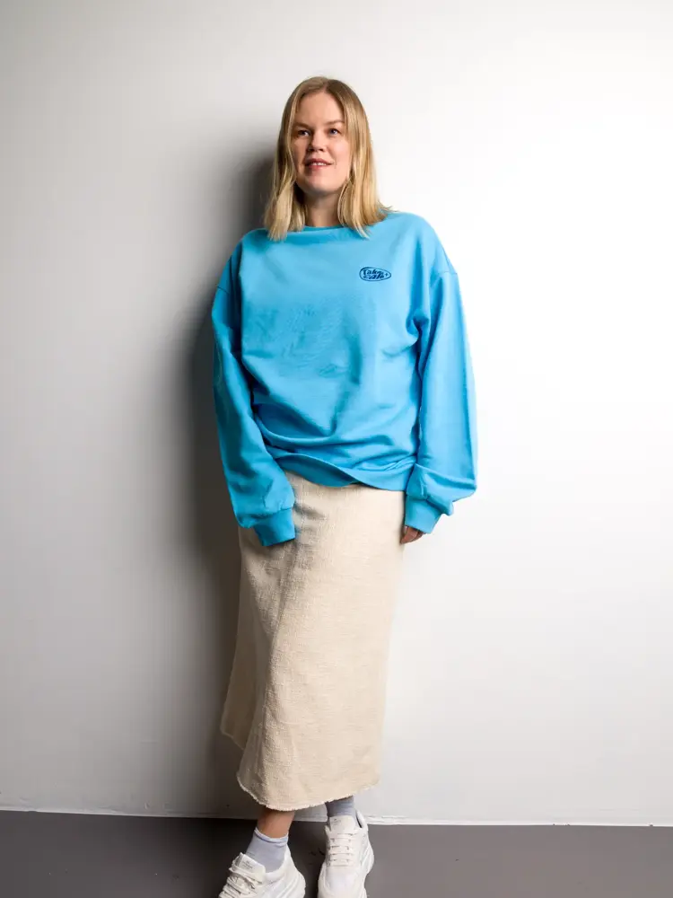 Strikk i kombinasjon med et omslagsskjørt gir en enkel, feminin og anvendelig stil. Blått er dessuten nydelig til solkysset hud.