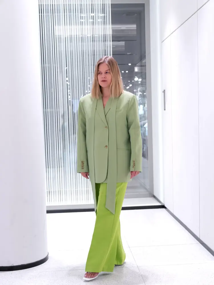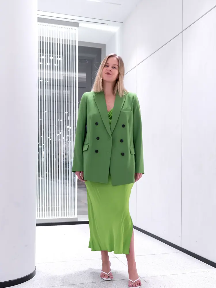 Satengkjole 449,- Grønn blazer 899,- // Grønn bukse 449,- Blazer 749,- Alt fra Zara