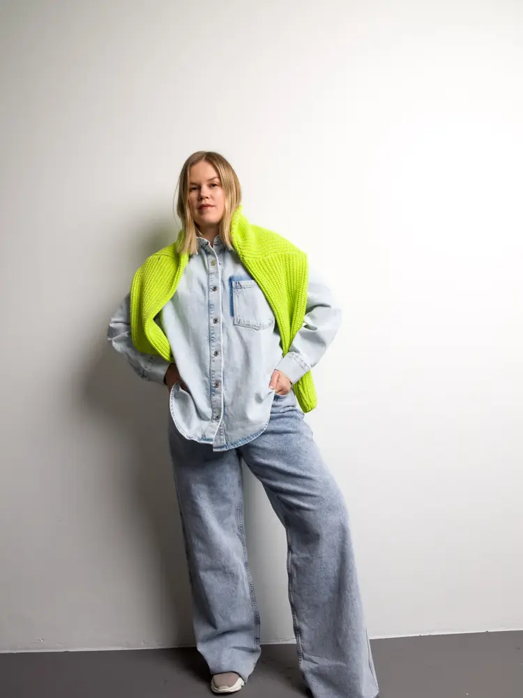 Lys denim er en vakker kontrast til farger. Et denimantrekk piffes opp av å ta en grønn genser over skuldrene. Små innslag av skarpe farger er fint, så du kan også bruke et denimantrekk til for eksempel rosa sandaler eller en knallfarget veske.