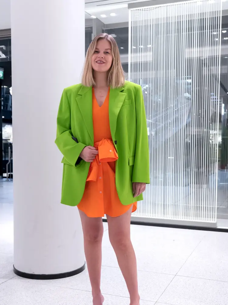 Oransje topp 399,- Grønn blazer 1195,- Skjorte brukt som skjørt 349,- Alt fra Zara