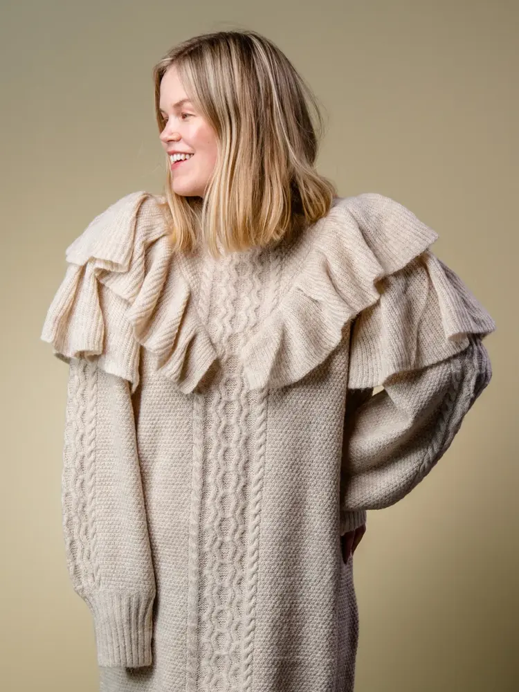 Fokus på skuldrene kan gi en spennende silhuett, alt ettersom hvor langt du våger å dra trenden. Men alt er lov, og det er i grunn kun. fantasien som setter begrensninger. En strikkekjole er ideell i mellomsesongen vi nærmer oss, og med mye volum og volanger får antrekket umiddelbart en kul vri. Style den med strømpebukser og et par chunky boots.