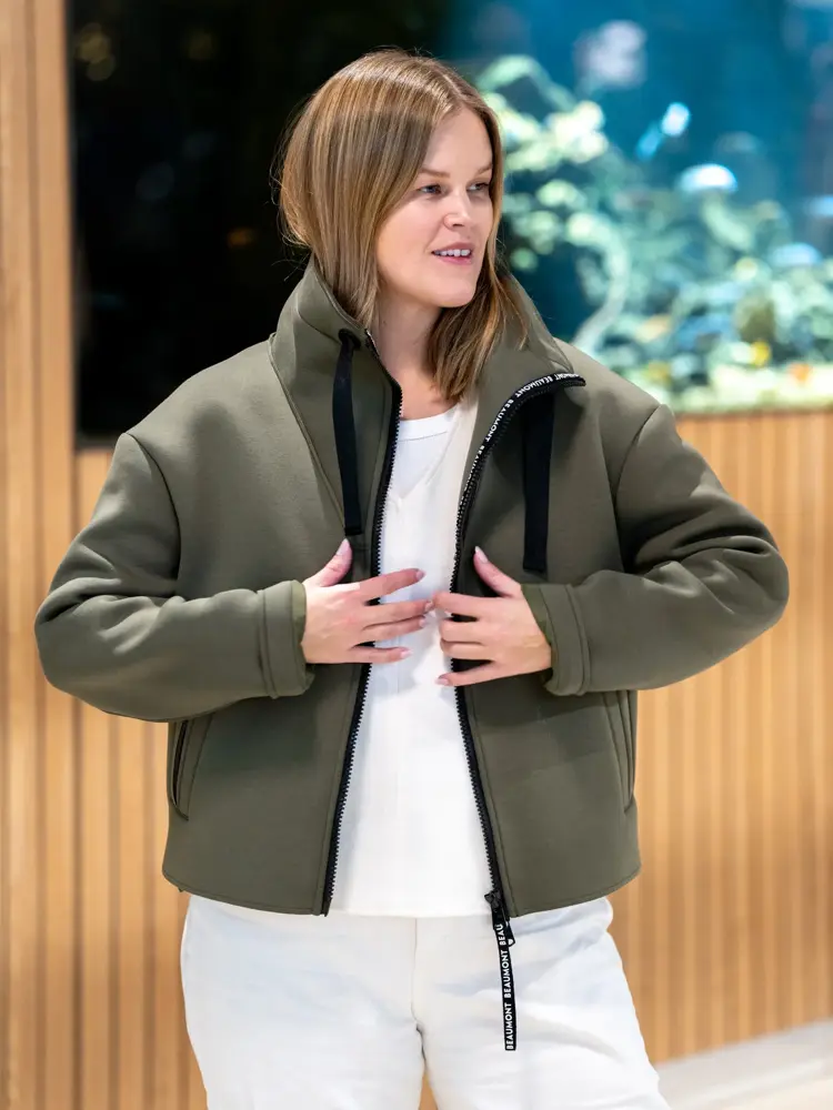 Scubastoff gir en kul tekstur og silhuett, som veksler mellom å være über-sporty eller stram modernisme. Bruk til lyse ullbukser for en moderne stil, eller style denne jakken med jeans, speakers og kule solbriller