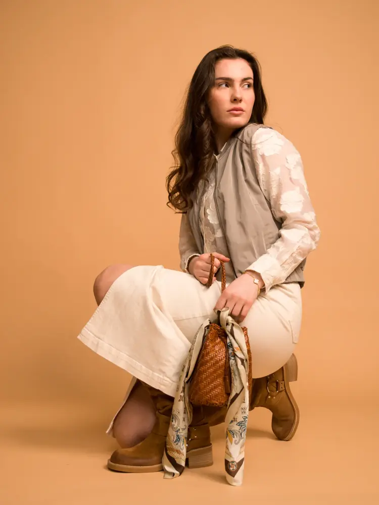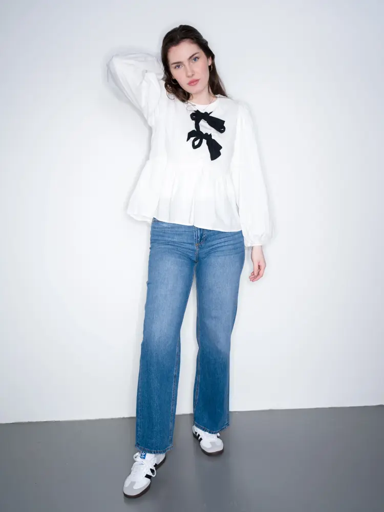 Bluse med sløyfer 449,- jeans 499,- alt fra Bero Moda | Jakke 1299,- skjørt 999,- veske 2299,- alt fra Swah | Sko Junkyard 1349,-