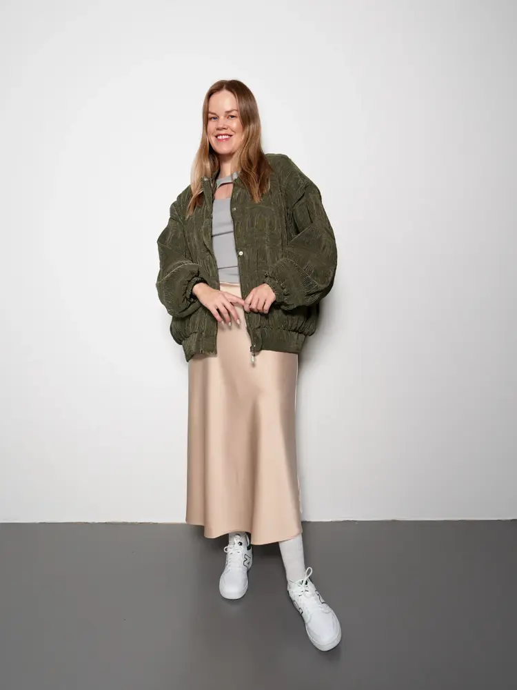 Venstre: Grønn bomber 3199,- t-shirt 1099,- skjørt 799,- alt fra Swah | Høyre: Jakke 2499,- bluse 1250,- skjørt 1400,- veske 2999,- boots 2999,- alt fra Sessa