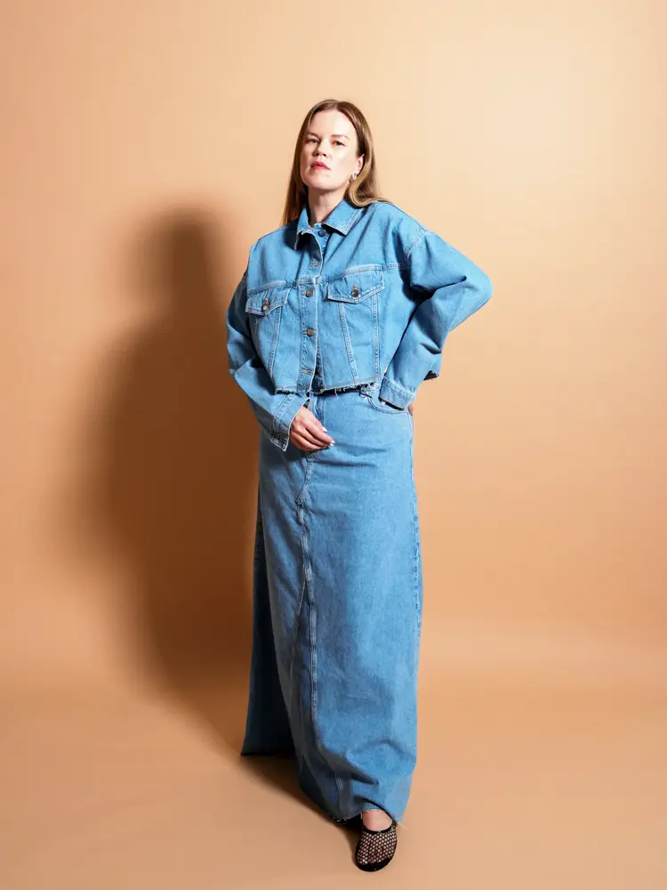 Denimskjørtet er kommet for å bli, og det som gjelder nå er lange lengder. Et denimskjørt i hvitt, grått/svart eller blått kan styles opp og ned i det uendelige - understrek det feminine med en kort trenchfrakk til, velg en enkel longsleeve eller gå for en pologenser. Dobbel denim i form av jakke og jeans er et sikkert kort, og vi har lagt vår elsk på et glitrende sett, stylet av Marianne med singlett med perledetaljer og brune boots.