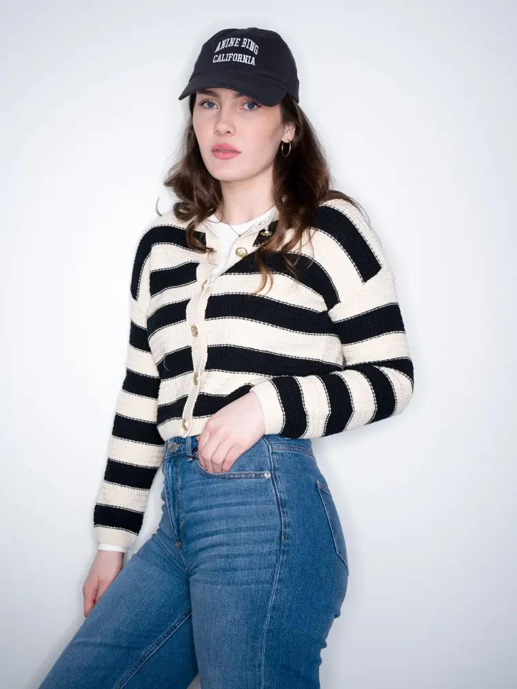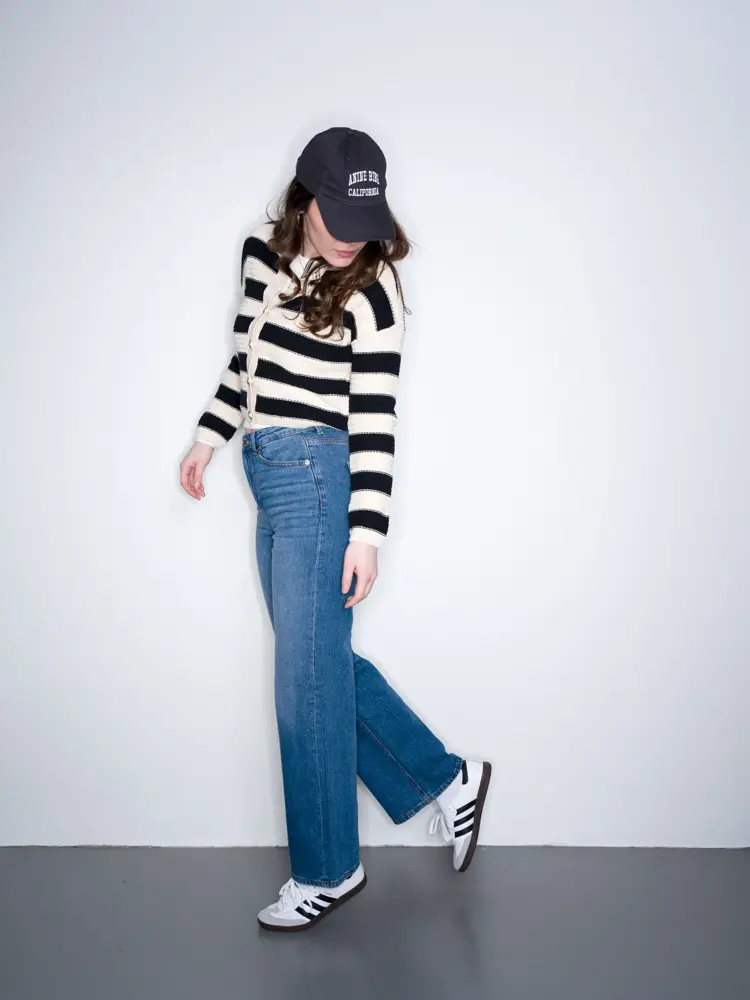 Stripete jakke 499,- jeans 499,- alt fra Vero Moda. Sko junkyard 1349,- Caps Kiman Woman 700.-