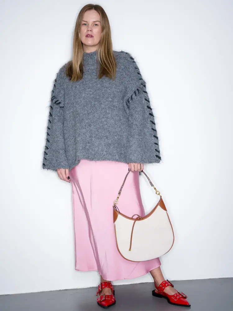 Øverst fra venstre: Rosa skjørt 379,- fra Zara. Sko Ganni 3195,- Strikket genser fra heltCOCO 699,- Veske 599,- fra Mango