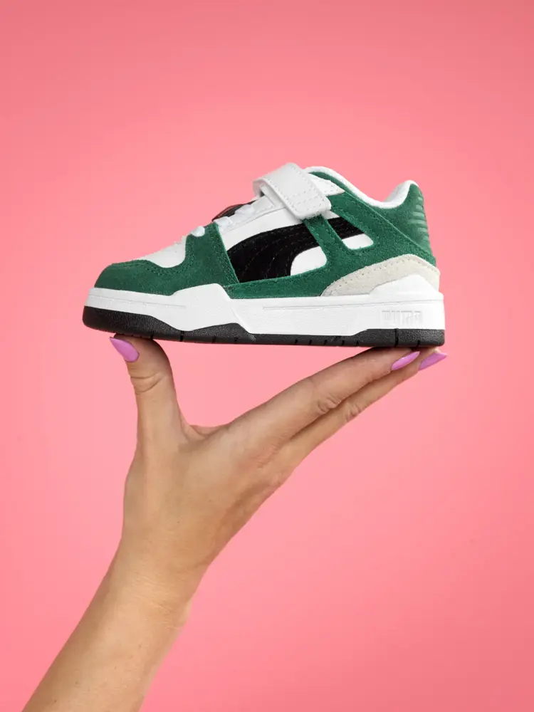Fra venstre: Grønne sneakers til barn fra Puma hos Foot locker, kr 629. Grå sneakers til baby og barn fra Foot locker, kr 679.