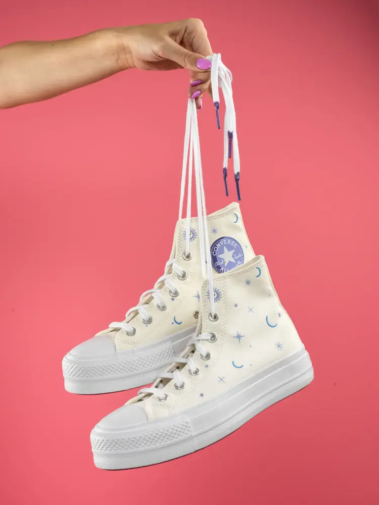 Fra venstre: Svarte converse med plattformsåle fra Foot locker, kr 999. Sneakers med måne og stjerner fra Converse hos Foot locker, kr 999.