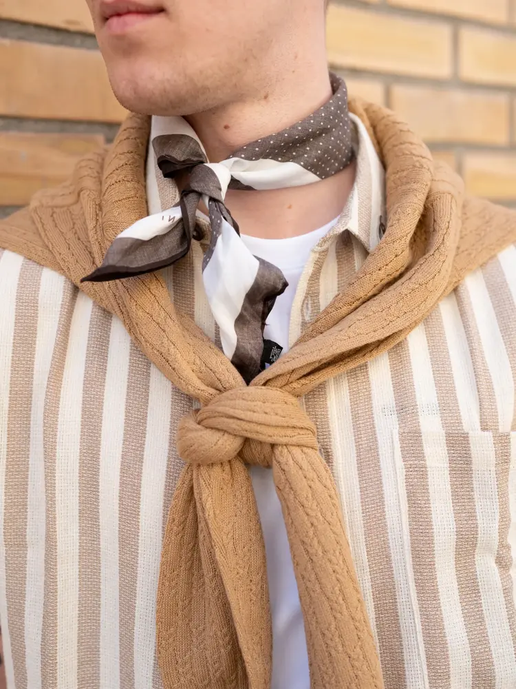 Sist, men ikke minst. Vesten i en minimalistisk vri, med en skjorte i matchende farge, tørkle i halsen og mørke chinos. Enkelt og ordentlig.