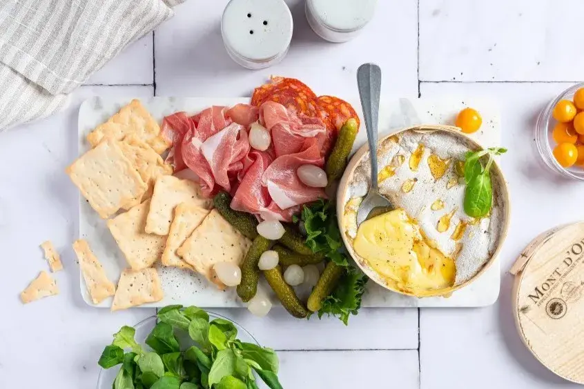 TIPS! Vi anbefaler å servere varm Mont d'Or på et fat med for eksempel spekemat, salat, frisk frukt, hakkede nøtter, honning, brød eller kjeks, og fiken- eller appelsinmarmelade.