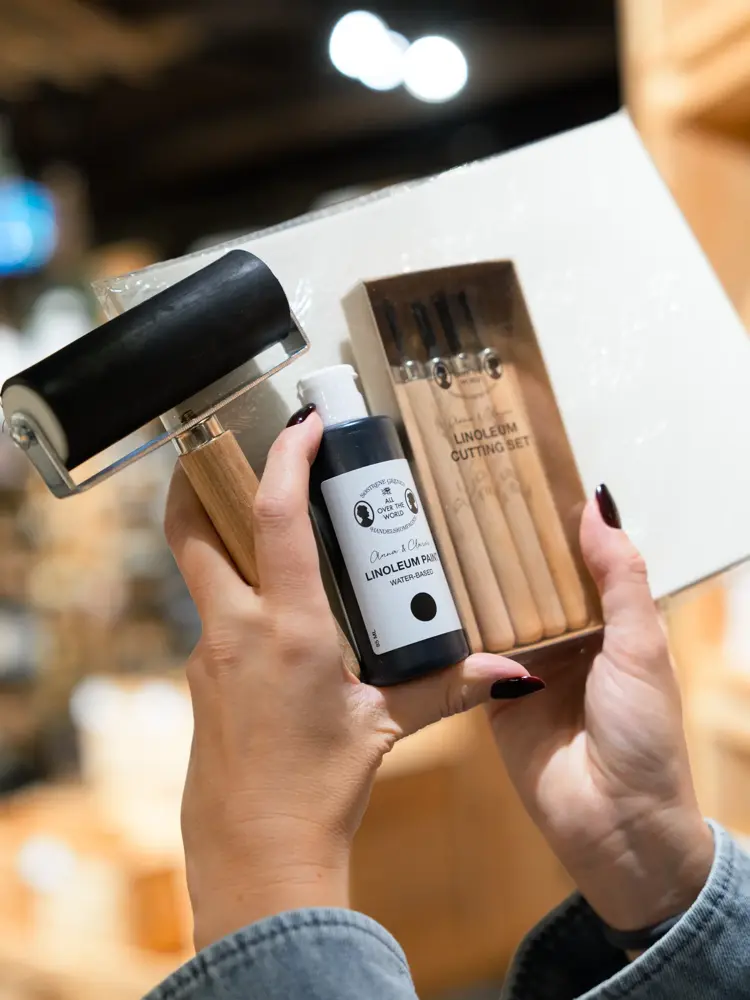 Velg blant akvarellmaling, akryl eller oljepasteller. For de litt eldre barna er linoleumstrykk spennende.