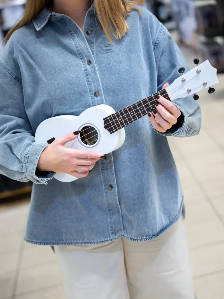 Vi falt pladask for denne flotte hvitmalte ukulelen.