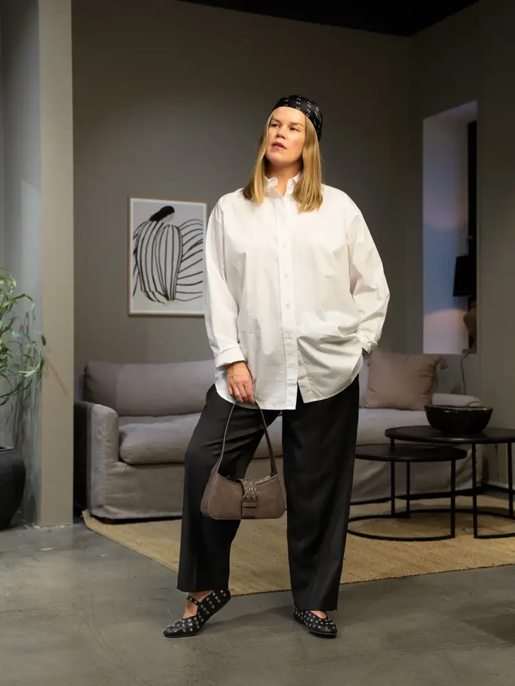 Skjorte fra Swah, kr 1100. Ullbukser fra Rhe Vibe, før kr 2400, nå kr 1200. Ballerinas fra Illums Bolighus, før kr 2249, nå kr 1600. Skaut fra Lindex, før kr 149, nå kr 45. Veske fra HM, kr 170.