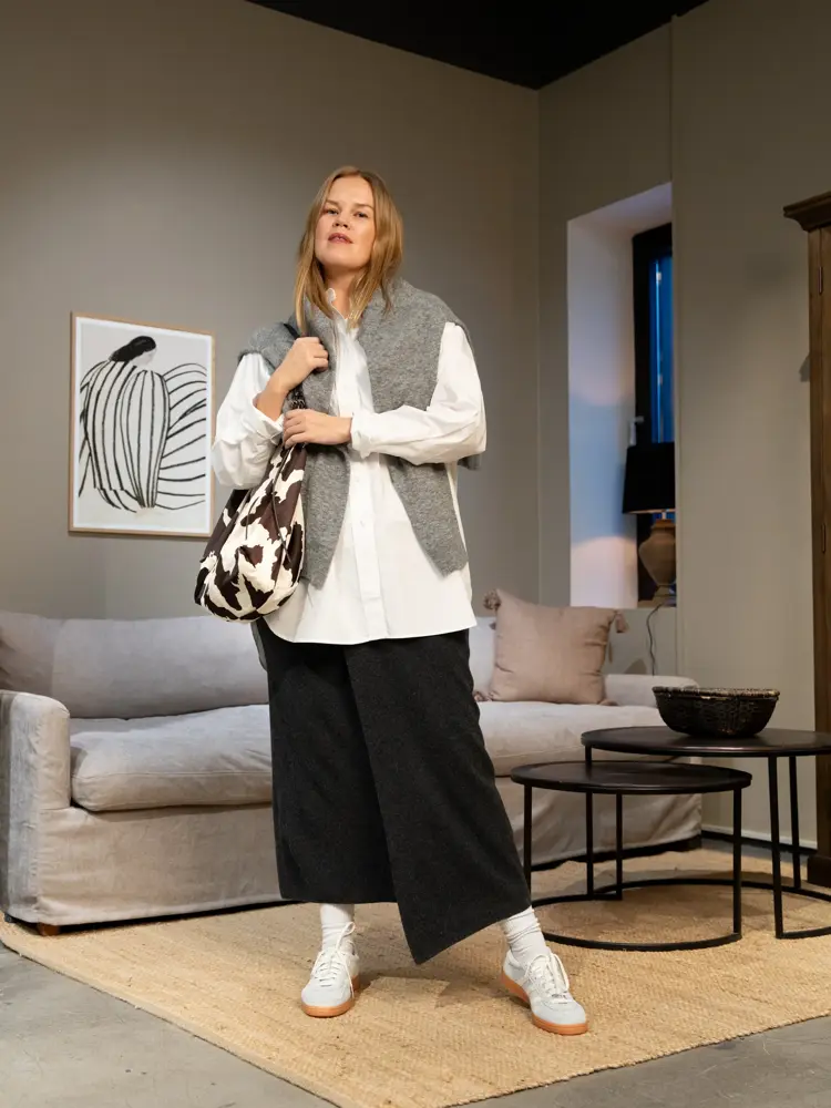 Den hvite skjorten er kanskje ikke det vi først og fremst forbinder med et avslappet plagg, skjorten er gjerne et formelt plagg for de fleste. Men, det betyr ikke at det ikke går. Du kan for eksempel style skjorten med en singlet under, kneppe opp skjorten og så kombinere med komfortable jeans eller myke bukser i merinoull. Vrien jeg gikk for i denne saken er å anvende skjorten til et mykt og godt ullskjørt, med sneakers og en strikkegenser du enten kan slenge over skjorten, eller bruke over skuldrene, som et slags sjal. Sneakers gir en avslappet helhet, og et ekstra lite blikkfang får du med en stilig kuprintveske.