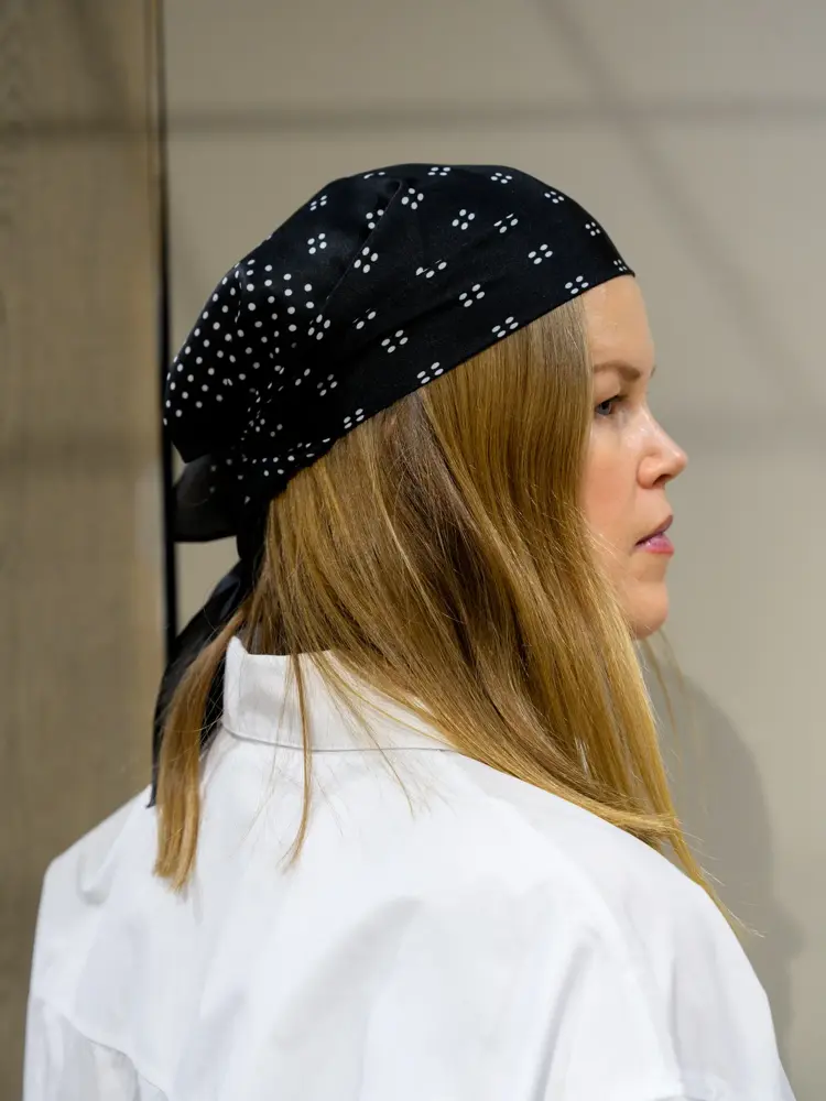 Hold det enkelt, og la tilbehøret snakke for deg. Skautet opplever en renessanse i motebildet, og jeg elsker det. Et monokromt skjerf i håret til en enkel base bestående av den hvite skjorten og svarte dressbuksen, gir egenart i bøtter og spann. Nagleballerinas bidrar til å dra opp trendfaktoren, og en semsket grå veske bryter litt med fargepaletten på en kul måte. Med hjelp av få elementer får du en personlig, komfortabel og kul stil.