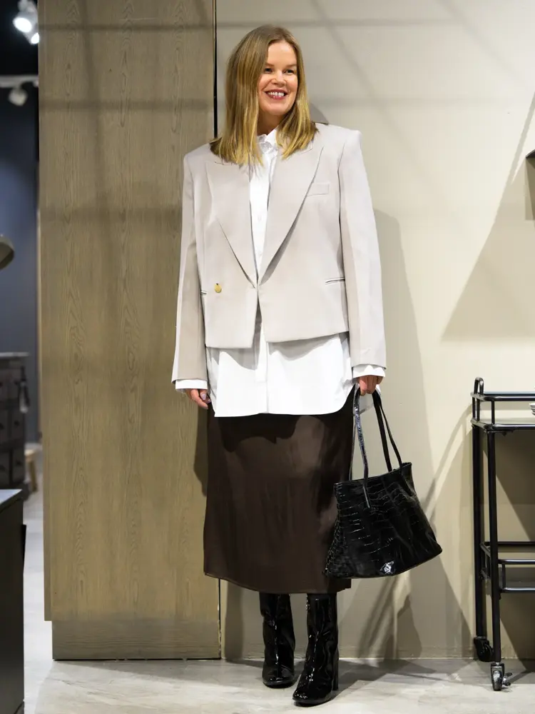 Hvit skjorte fra Swah, kr 1100. Jakke fra Mango, 799. Brunt silkeskjørt fra Line of Oslo, kr 840. Boots fra Sapatos, kr 1747. Svart krokoveske fra Illums Bolighus, kr 1330.