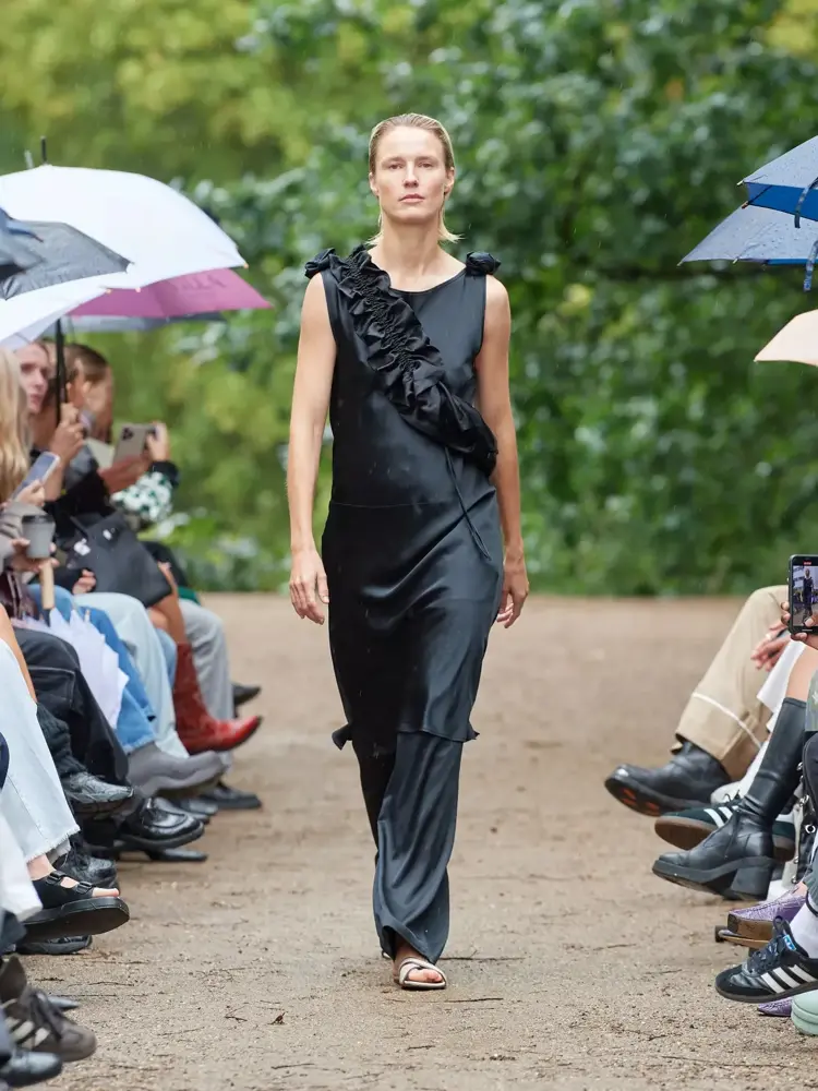 Svart er alltid uansett tilstede i motebildet. Men for vårsesong å være, er denne mørke tonen mer synlig enn den har vært på lenge. Hvordan? Jo, vi snakker fotside kjoler, sofistikerte og elegante snitt, lag på lag med silke og deilige voluminøse detaljer. Materialene får skinne og tilbehøret holdes ellers til et minimum. Svarte solbriller på nesetippen er det eneste du i grunn trenger til.