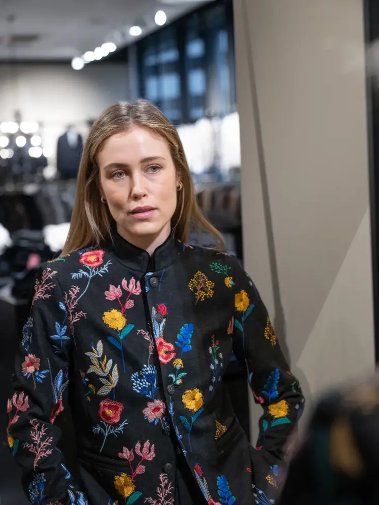 Komfortable og praktiske klær med godt snitt og høy kvalitet kjennetegner utvalget hos Freyja. Denne jakken er et skikkelig blikkfang, med svart base og broderte blomster.