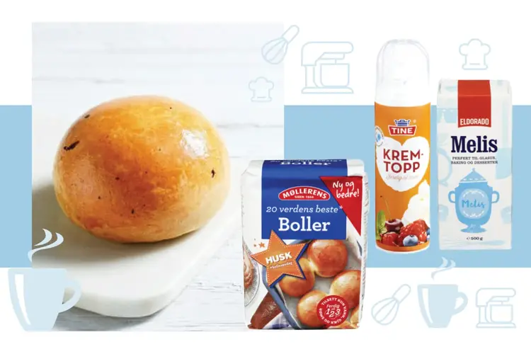 Har du ikke tid til å elte, heve og rulle ut boller kan du enten kjøpe ferdige boller hos Meny, eller avansere litt med en bollepakke du setter selv. Kremen får du kjøpt på sprayflaske og med litt melis på toppen er du klar!