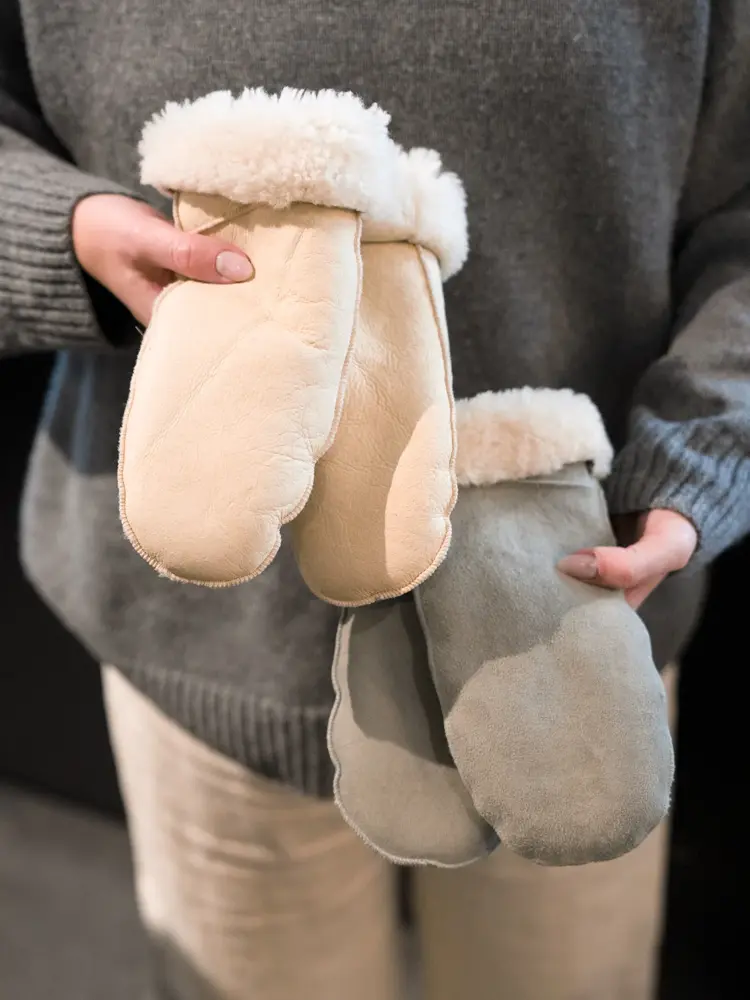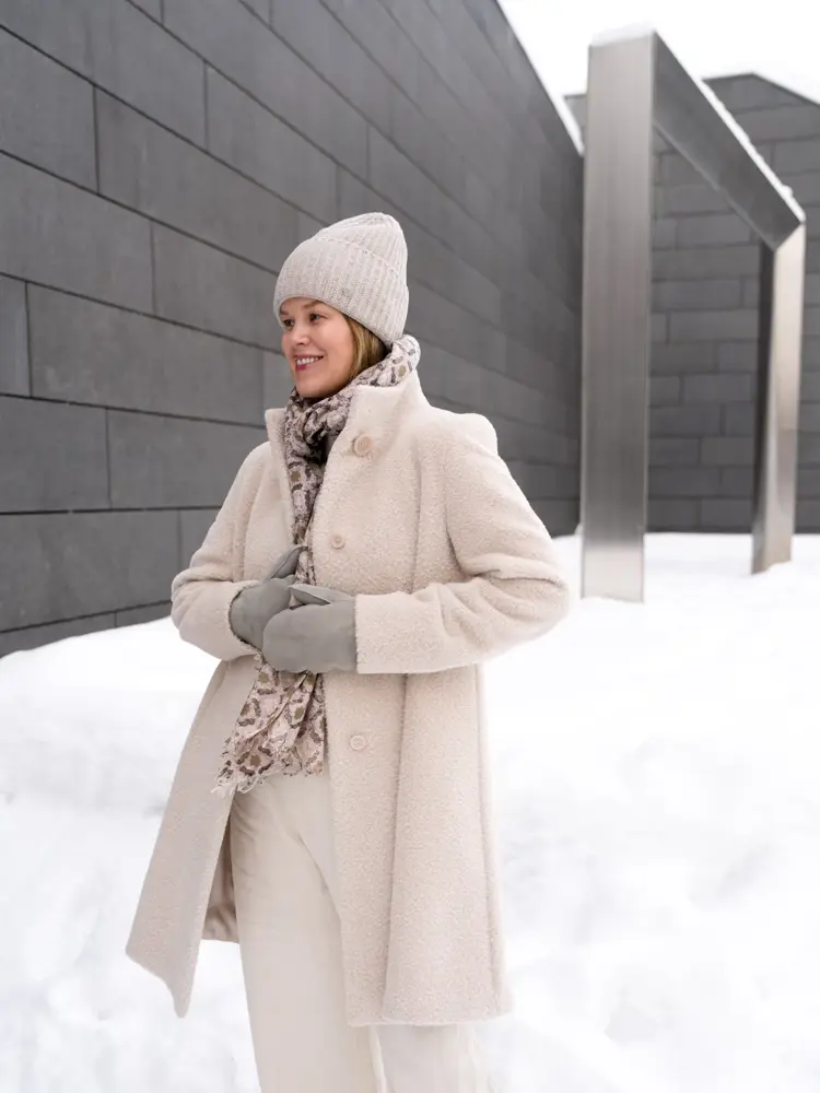 Et antrekk i en lys fargepalett er skikkelig flott om vinteren. Det lyser dessuten opp, siden de aller fleste har en tendens til å velge mørke farger. En kasjmirgenser til dressbukser er et pent og sofistikert utgangspunkt, og følges opp med en lys ullkåpe, fantastiske votter i saueull og varmt tilbehør.