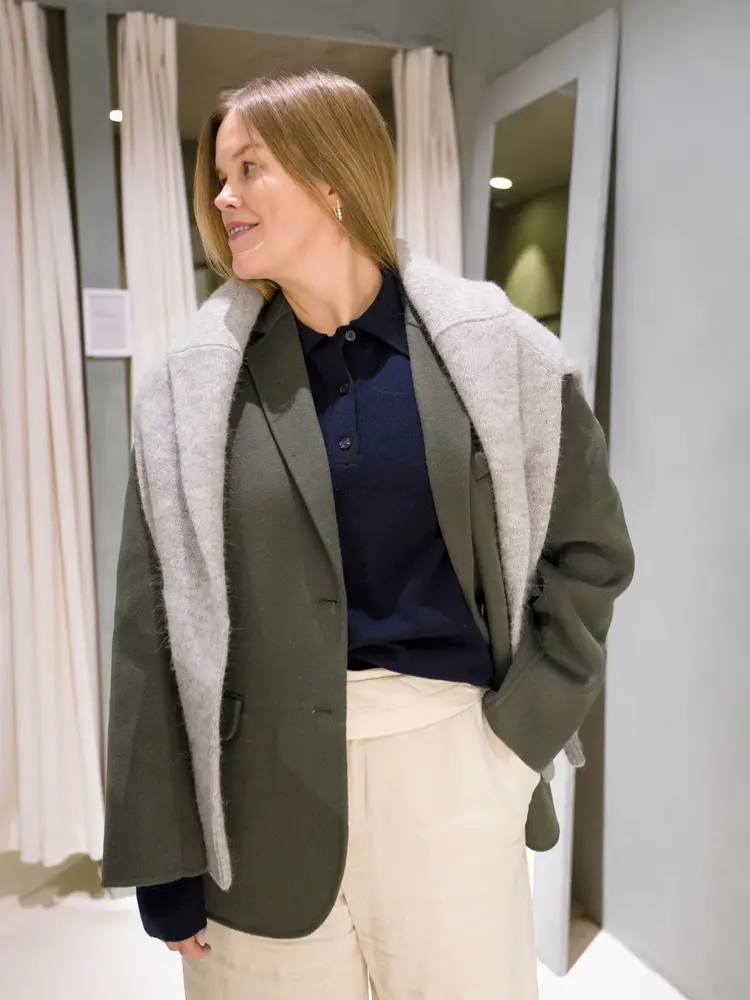 Lag på lag gjør selvsagt susen. En tynn ullpiquet under en blazer i dobbellagsull gir både et stilrent uttrykk, og sikrer at du har flere lag som isolerer fra kulden. Fullfør med en strikkegenser som henger over skuldrene på de ekstra kalde dagene. Denne kombinasjonen kan like gjerne brukes til jeans som til dressbukser i ull.