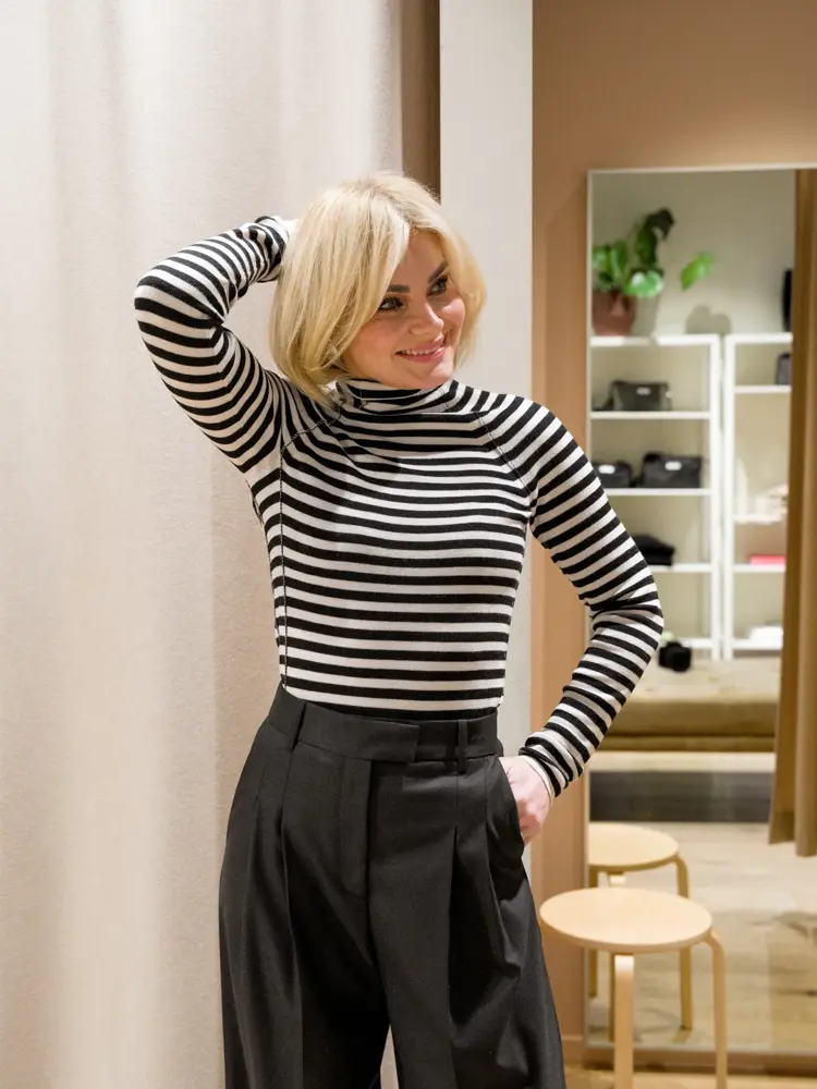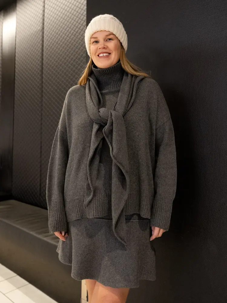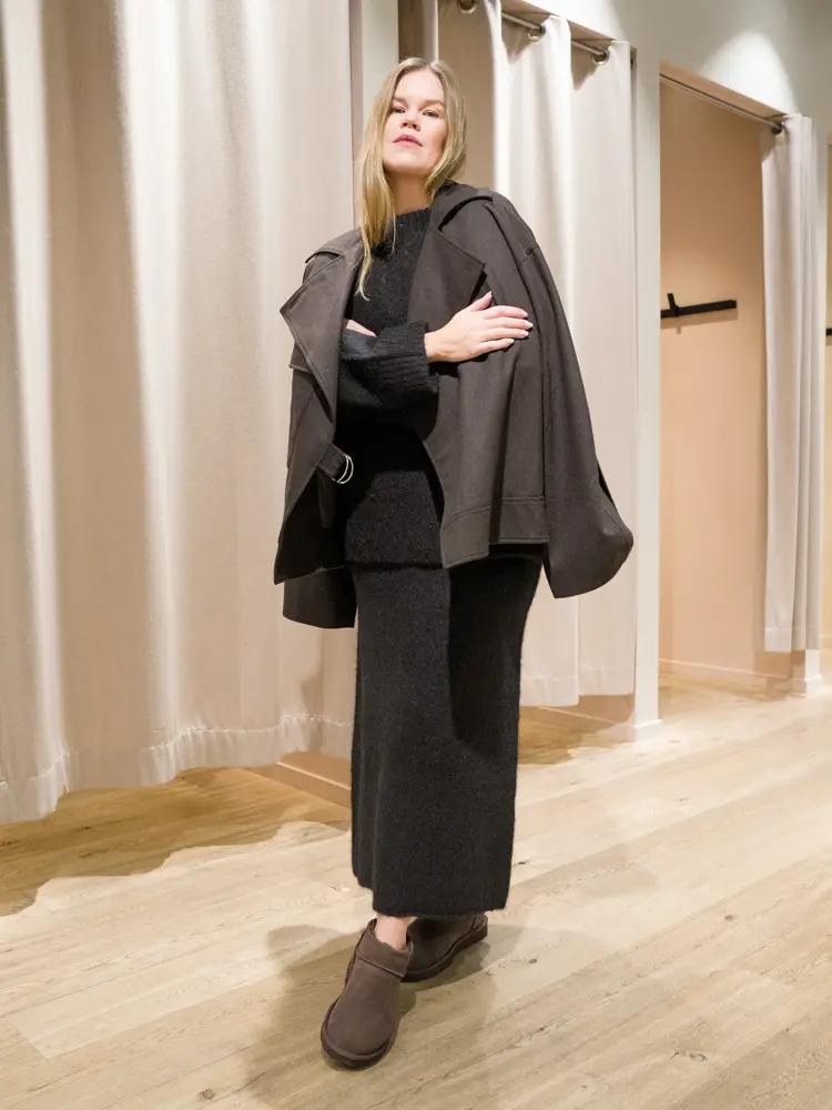 Et antrekk vi ser flere steder i butikkene rundt om på senteret er genser og skjørt i sett, i myk og varm ull. Et slikt sett holder deg varm, på de ekstra kalde dagene kan du dra på en overtrekksbukse over strømpebuksen på vei til jobb, og dette antrekket funker supert til boots eller loafers på jobb.