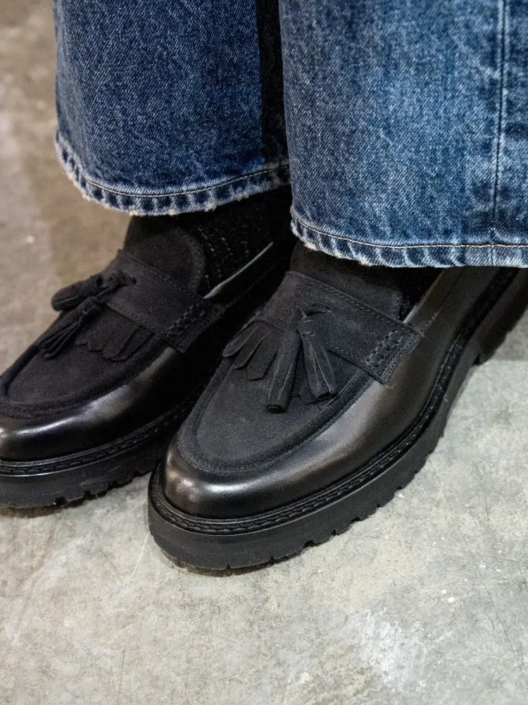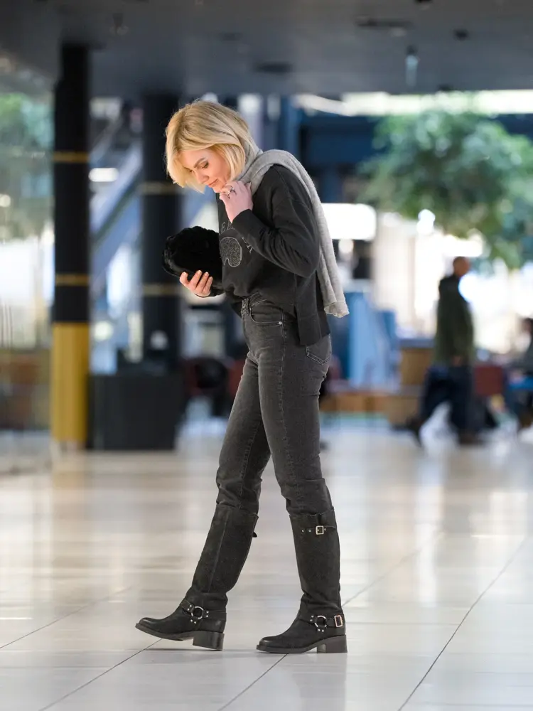 Et helsvart antrekk gjør alltid susen. Her er det et par små elementer som det lille ekstra. Vi snakker om semskede knehøye boots og genser med påskrift. Trendy og spennende. Et mykt ullskjerf surret godt rundt halsen bryter med det mørke, og gir antrekket et snev mer mykhet.