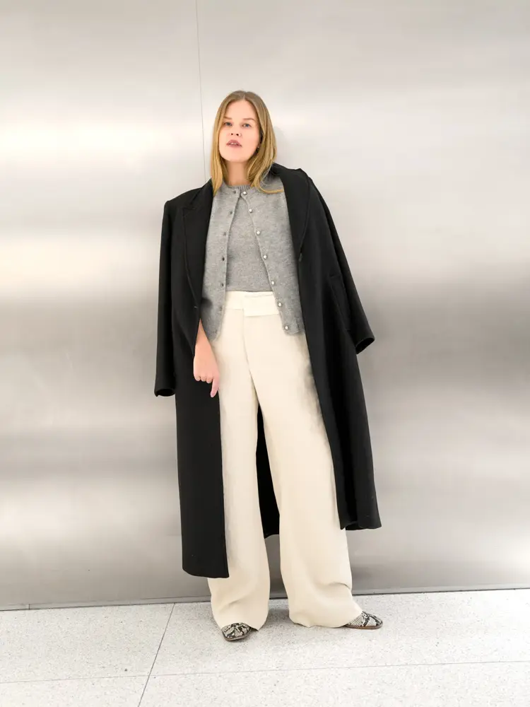 Eller gå for en tynn trøye med en pen ulljakke og skjerf over. Blir du varm er det flere lag du kan fjerne ved behov. Fullfør med dressbukser i ull og chunky boots.